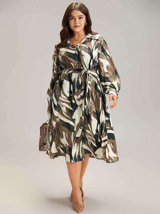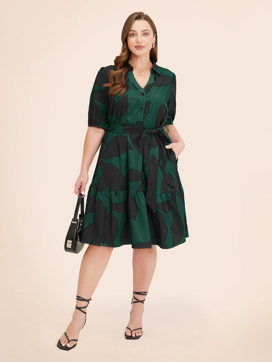 Plant Pocket Puff Sleeve Belt Ruffle Hem Button Up Dress