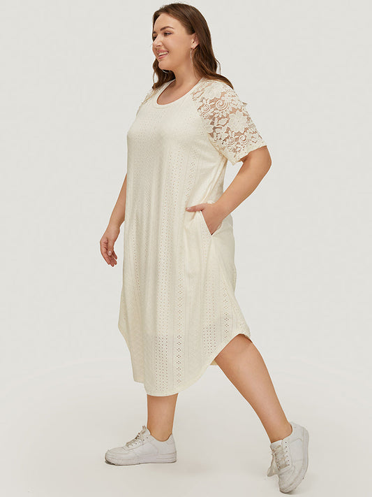 Plain Lace Sleeve Pocket Arc Hem Broderie Anglaise Dress