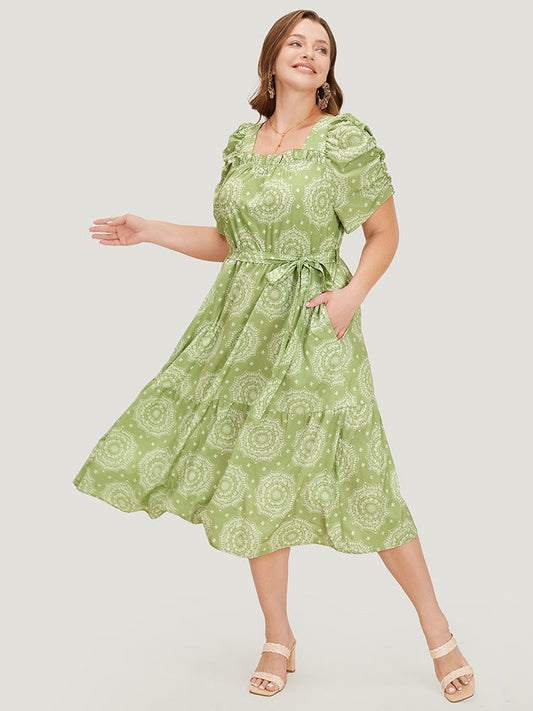 Bandana Print Ruched Sleeve Frill Trim Pocket Belt Dress