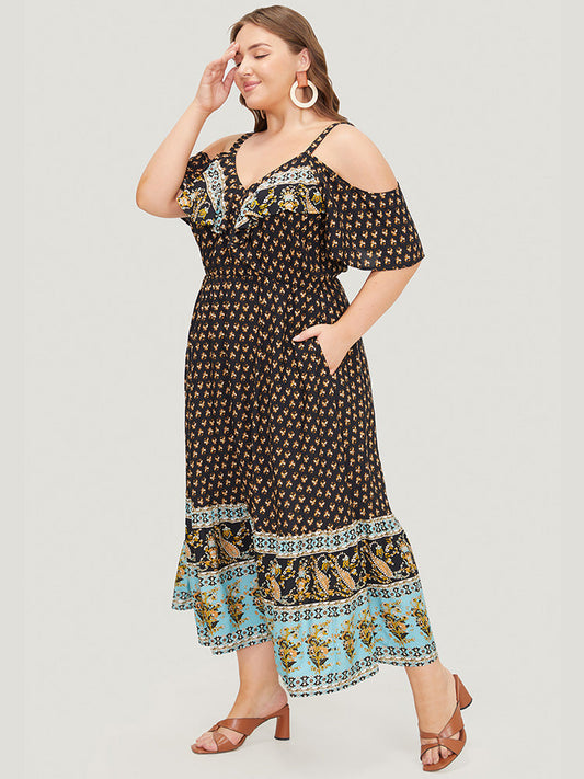 Bandana Print Pocket Ruffle Trim Cold Shoulder Maxi Dress