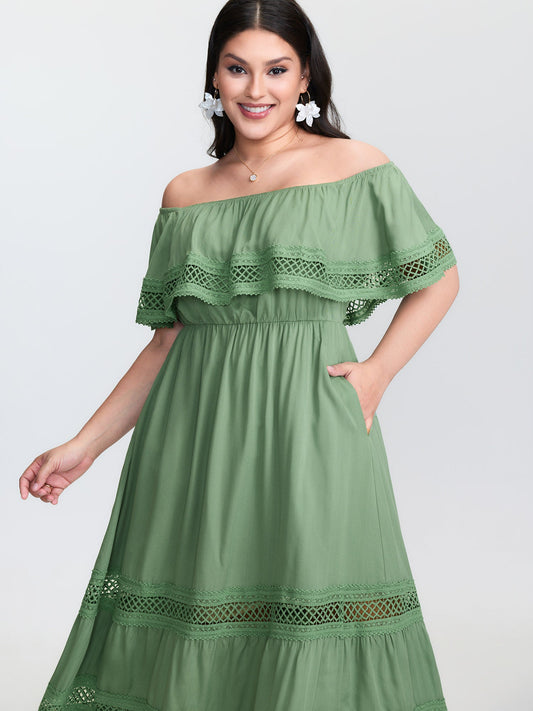 Off-Shoulder Stretchy Waist Lace Trim Maxi Dress