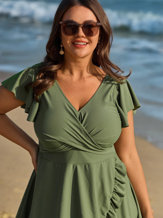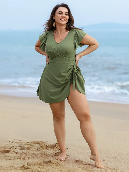 Ruffled Sleeve Curvy Hem Swim Dress