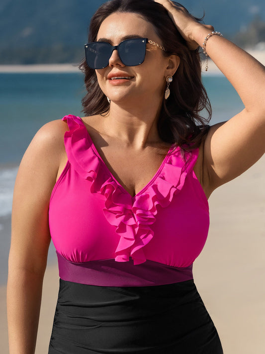 Color Contrast Ruffled Trim One-Piece Swimsuit