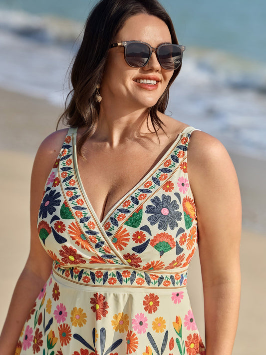 Floral Surplice Neckline Pockets Swim Dress