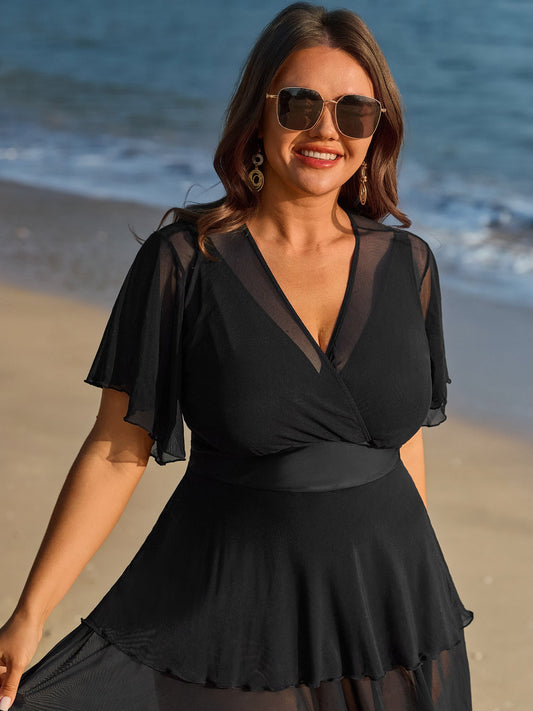 Sheer Ruffled Sleeve Layered Swim Dress