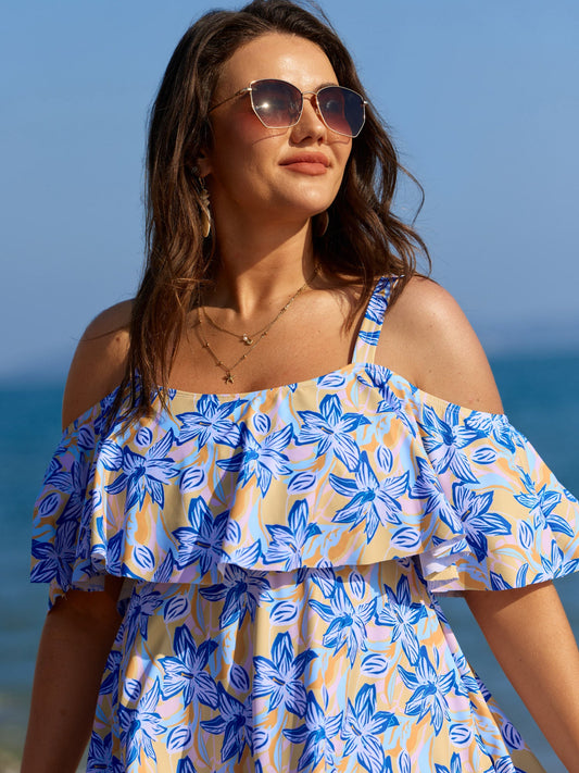 Floral Ruffle Trim Off Shoulder Pockets Swim Dress
