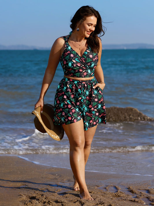 Tropical Flower Print Pockets One-Piece Swimsuit