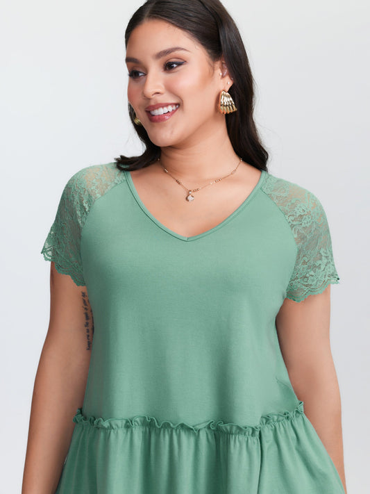 Sheer Lace Sleeve Ruffled Hem T-Shirt